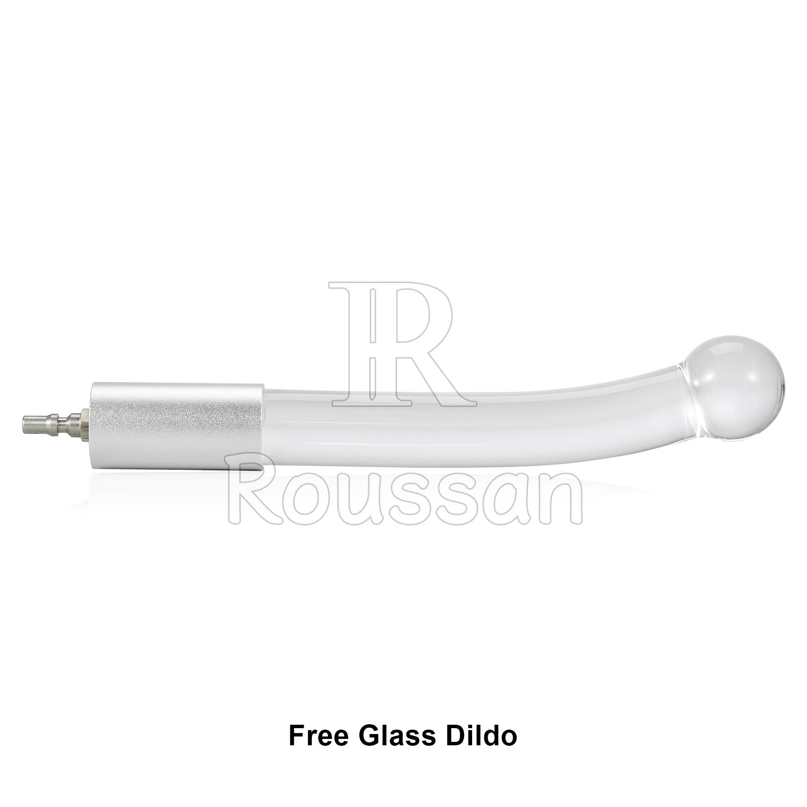 It comes with a silicone dildo (7.87 inches / 20 cm) and a glass dildo (8.86 inches / 22.5 cm).