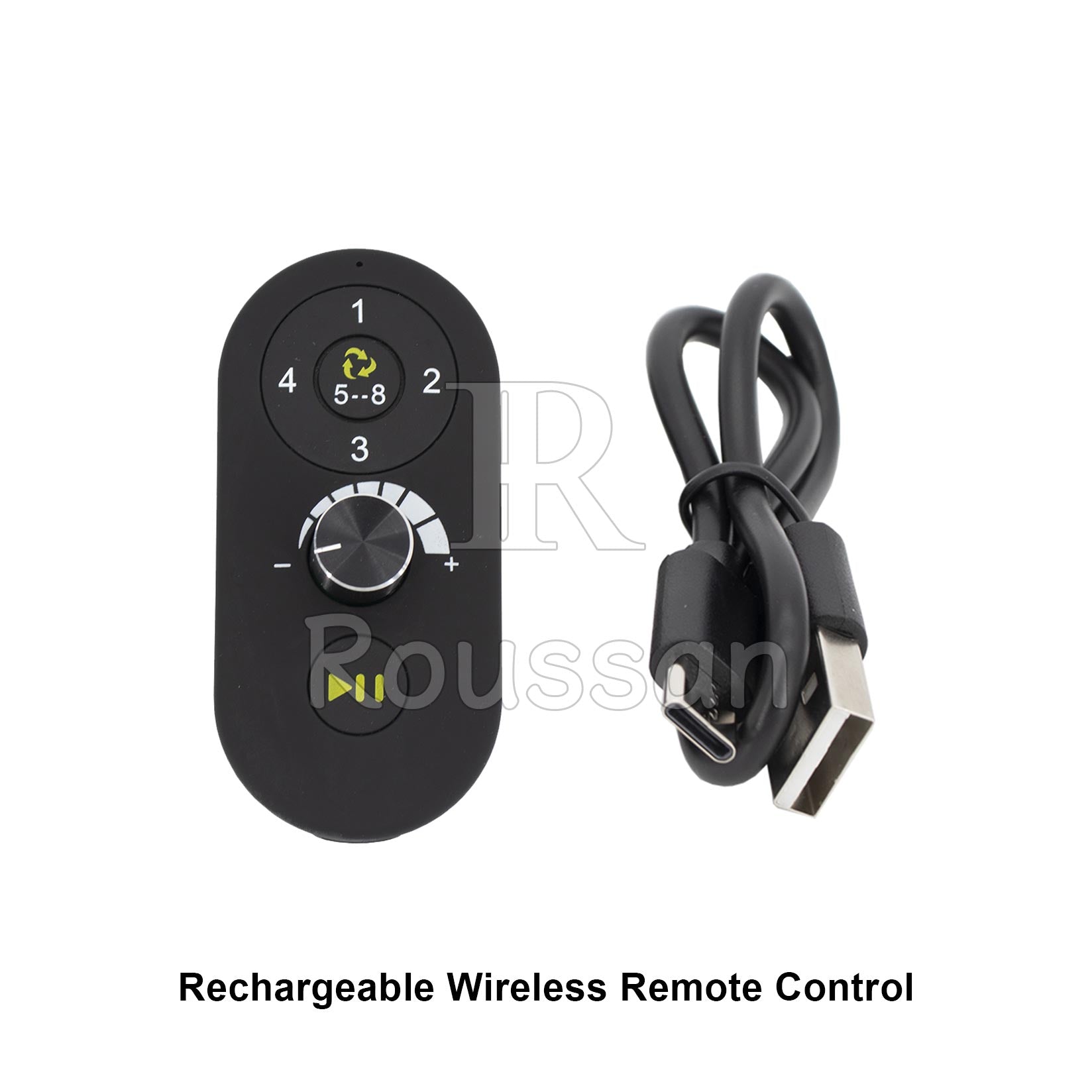- Wireless handheld remote control with push button start/stop and built-in modes.